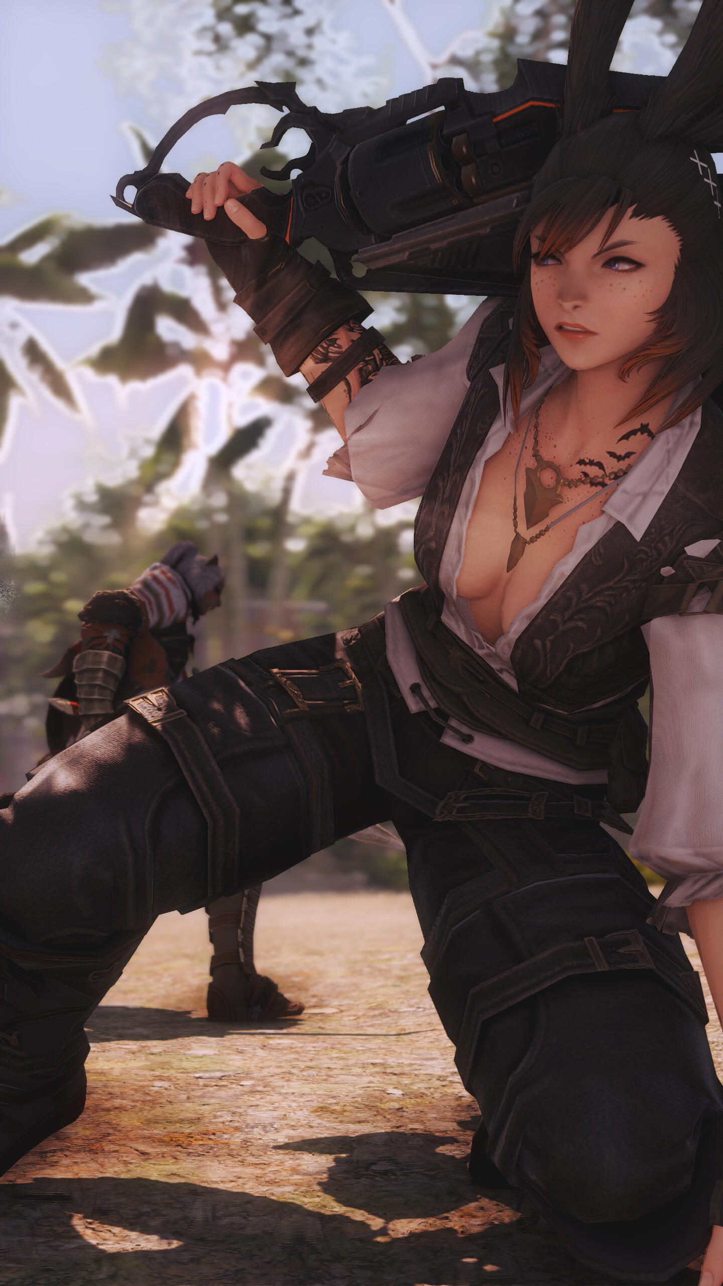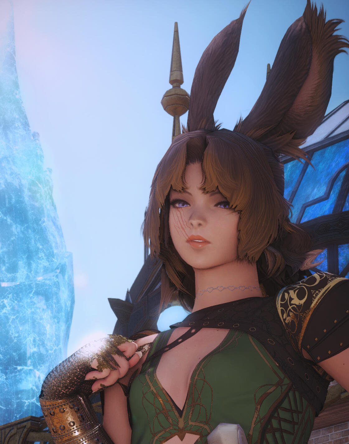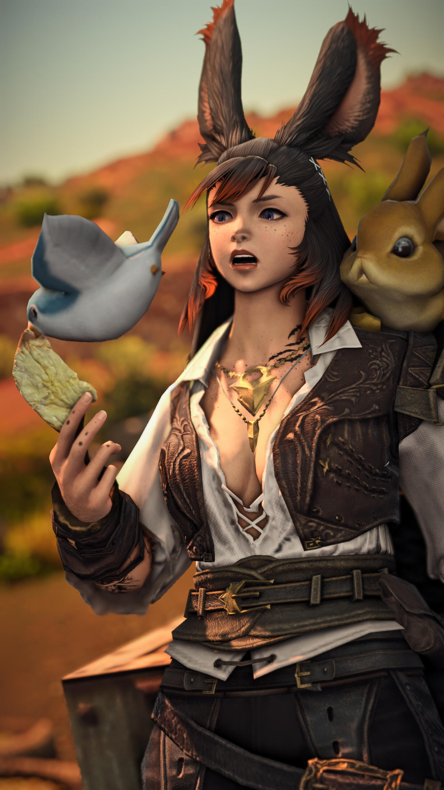 An honest mercenary, well traveled, and handy in and out of combat, Belle is a brown haired Veena Viera.Growing up outside of a traditional Viera settlement, Belle was raised by her parents in a village in REDACTED, where she grew up to become a village protector, hunter and gatherer. Well into her teenage years, she met a dainty young Xaela woman, appearing to be a similar age, wandering the outskirts of town. Upon learning her name, and opting to call her "Bizzy" instead, the two headed back to the village and Belle introduced her newfound friend.Quickly becoming the closest of friends, Belle would take her out on scouting trips when it was deemed safe, and the two spent the majority of their time by eachother's side.Belle's life is flipped on its head when her village is attacked. Having taken Bizzy on a small trip outside the village, the sound of fighting brings them both racing back, only to find they are too late to stop the slaughter, and with Bizzy being incapable of holding her own, Belle is left to clear the village of bandits on her own, resulting in either side having no survivors, save Belle and Bizzy. Distraught, the two comfort eachother, and hold a mass funeral for the villagers, including Belle's own parents.Belle and Bizzy set out to travel the world, determined to find a new home and regain the family they have lost. Years go by as they travel, making somewhat of a name for themselves, including the events of Heavensward, where Belle and Bizzy are entwined in the Dragonsong war.Acting as her trusted retainer, Belle stands by Bizzy's side as she fights for her kind against the religious ruling of the Holy See. As a result of Bizzy's actions during the war, it is revealed to Belle by a mysterious figure that the young Xaela woman is not all she seems, a note dropped by Belle's bedchambers reveals Bizzy's true name, a name she had long forgotten, and with it, knowledge of her true power as a Great Wyrm in digsuise.Upon learning the reality of her own friends being, and the reason behind her inaction during the attack on Belle's village, she is disgusted, and write a short letter to Bizzy, left behind in the middle of the night for Bizzy to find in the morning.The note details a location, and tells Bizzy to come armed, as it could be dangerous.The two meet again in a remote location in the Churning Mists, Belle waits patiently for Bizzy to arrive, and when she does, Belle, consumed by rage and despair, attacks Bizzy, catching her off guard, and with Belle's combat skills far surpassing Bizzy's, the bout is over quickly, and Belle leaves her for dead, wishing to never see her again.